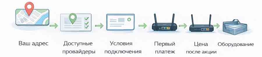 Начинать нужно с проверки доступных провайдеров по точному адресу. После этого уже стоит смотреть цену первого месяца, цену после акции, оборудование и условия договора. Именно такая последовательность дает наиболее точное понимание будущих расходов.